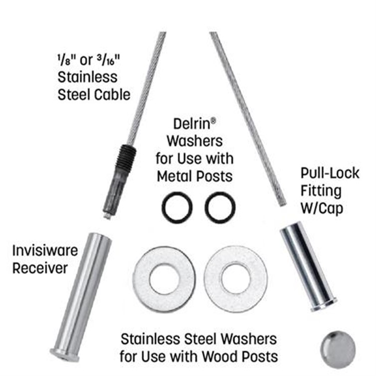 Ultra-tec® 224 Series Cable Assemblies are for assembly of 10' cable railing sections designed for outside-to-outside mounting through 2.375" metal posts. Assembly kit includes 316 stainless steel 3/16" cable, an Invisiware® Receiver and Pull-Lock® non-swage fitting to ensure you have the necessary components for your cable railing assembly. Cable must be cut to size in the field to ensure appropriate length for installation.