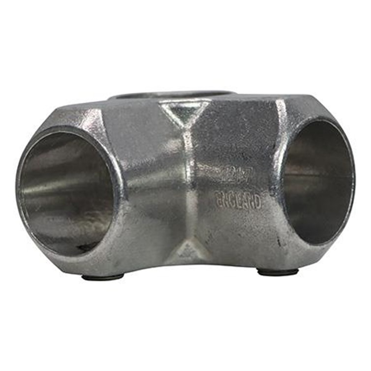 This 90-degree Side Outlet Tee for 1-1/4" pipe is most frequently paired with part KKL20-7 to give a 90-degree corner joint for the middle rail of safety railing and other rectangular structures. The upright passes through the fitting.