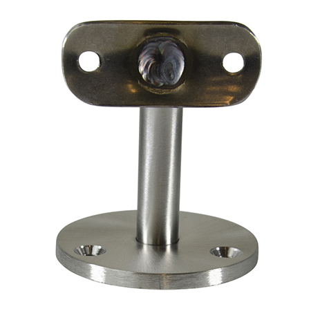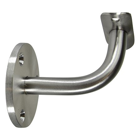 Type 304 Stainless Steel Assembled Wall Mount Bar Bracket features a brushed satin finish. Bracket projects 3-1/4" with a round saddle. Provided with three countersunk holes for 1/4" mounting screws.